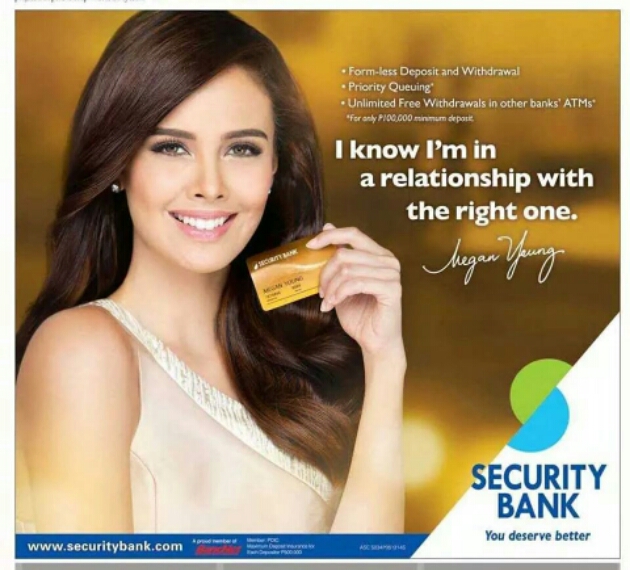 Sa Security Bank advertisement sinabi ng endorser nilang si Megan Young (Miss World 2013) na siya raw ay nasa tamang relasyon sa kaniyang pinagbabangkohan. Mukhang hindi naman ito masasabi ng mga kliyenteng hindi naman nabigyan ng tamang abiso, sa tamang oras.